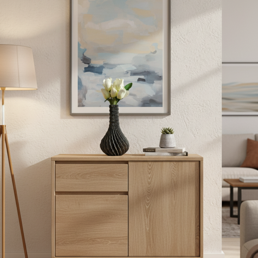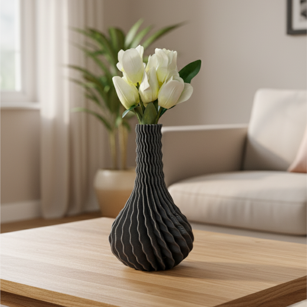 Elevate your home with The Undula Vase, a stunning piece of 3D-printed art. Inspired by the gentle, rhythmic motion of sea waves, this modern rippled vase features a continuous, undulating texture that creates a mesmerizing play of light and shadow. Its unique sculptural form—a perfect balance of a full, bulbous base and an elegant, narrow neck—makes it a perfect statement piece for any room.